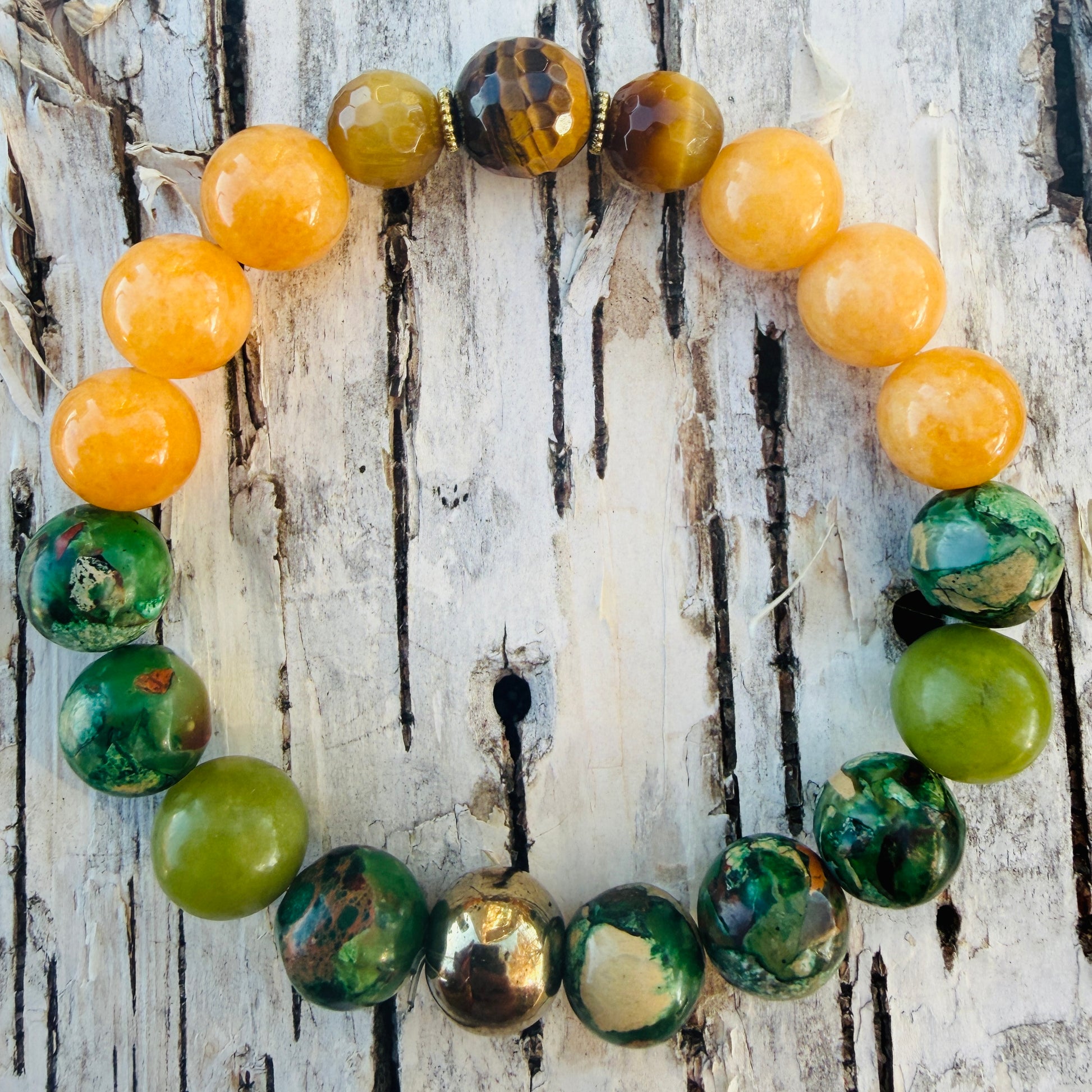 Keywords: sunflower bracelet, joy and light jewelry, golden tiger eye meaning, jade and jasper bracelet, resilience gift for her, seek the light bracelet, handmade floral-inspired jewelry