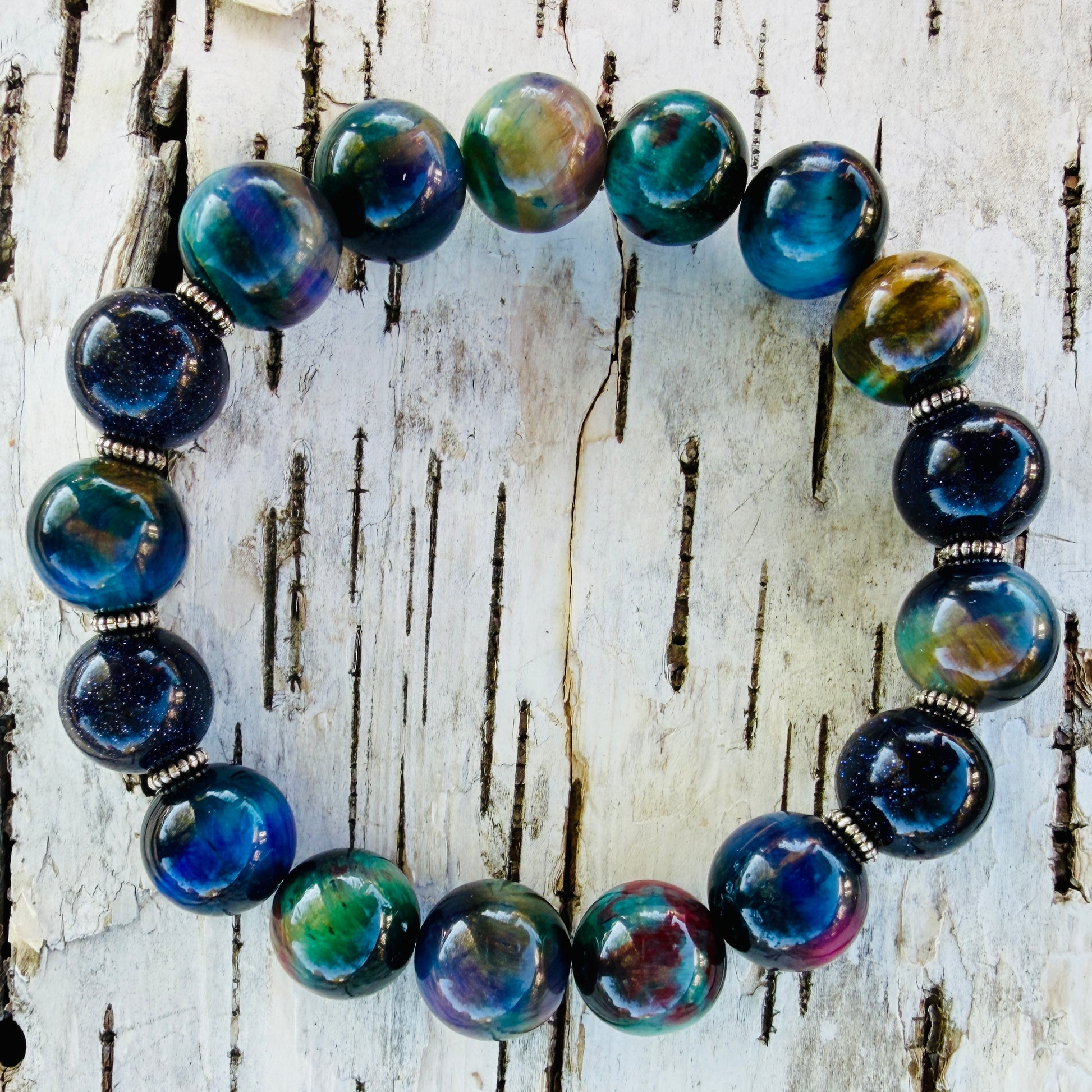 Keywords: northern lights bracelet, blue goldstone and tiger eye jewelry, aurora borealis gift, wonder and magic bracelet, night sky inspiration, handmade mystical jewelry, embrace beauty and mystery