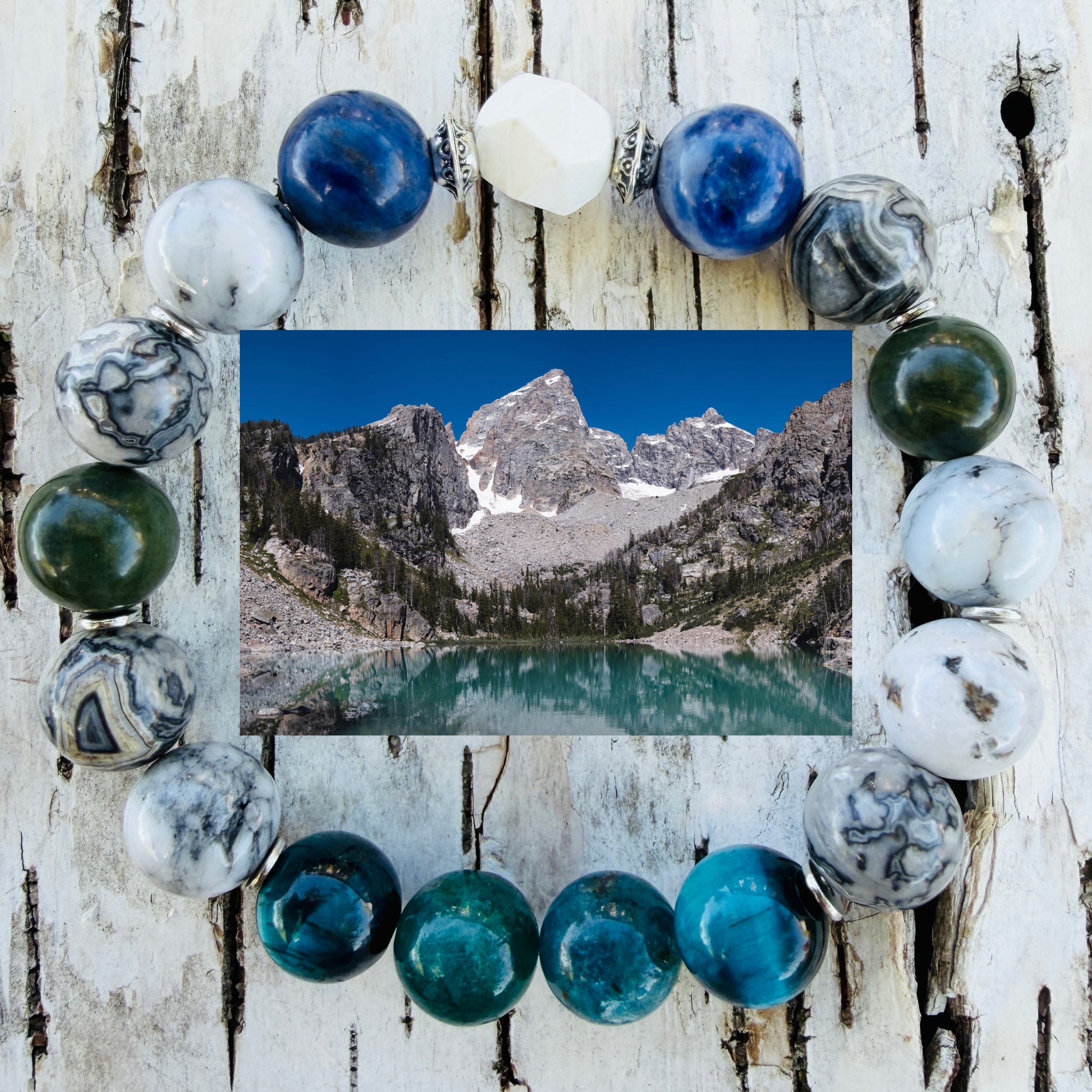Keywords: Grand Teton bracelet, mountain inspired jewelry, strength and grounding bracelet, sodalite bracelet, howlite bracelet, jasper bracelet, dendritic agate bracelet, apatite bracelet, nature inspired bracelet, adventure jewelry, boho mountain bracelet, grounding gemstone bracelet, unshakable strength jewelry, handmade gemstone bracelet, outdoor spirit jewelry