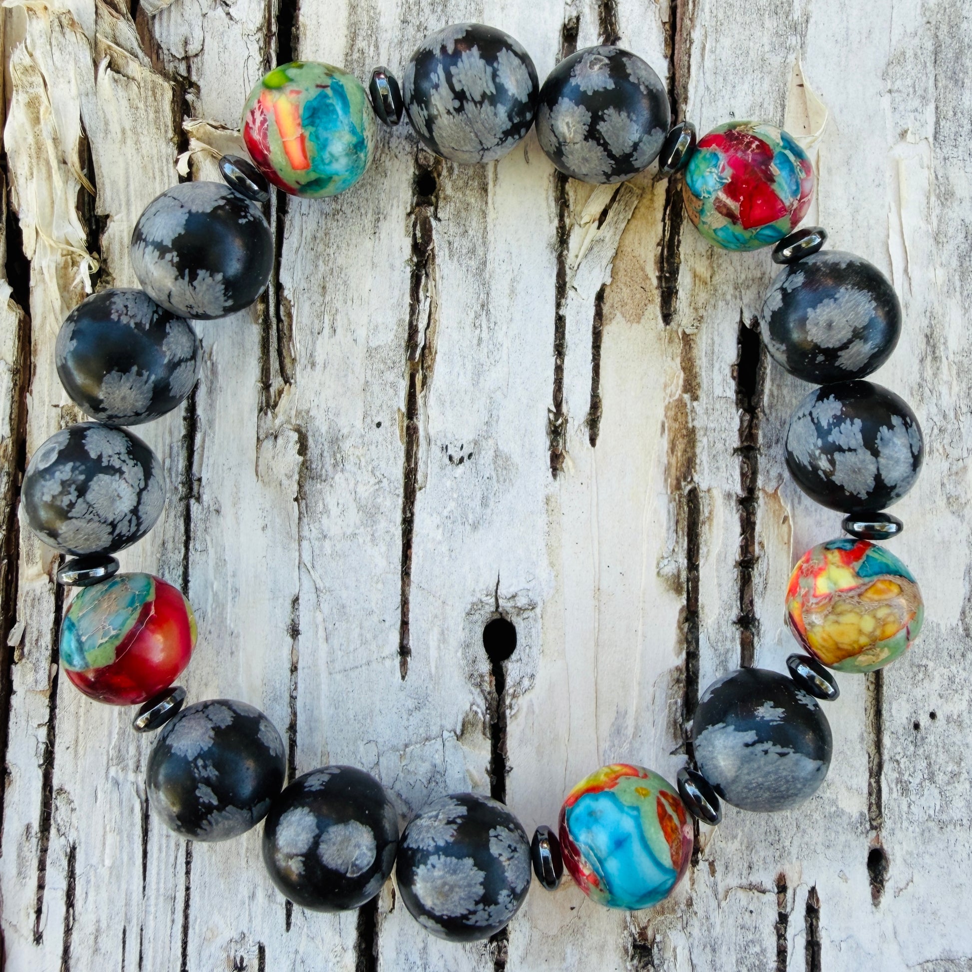 Stones: Snowflake obsidian and multi-colored jasper.
