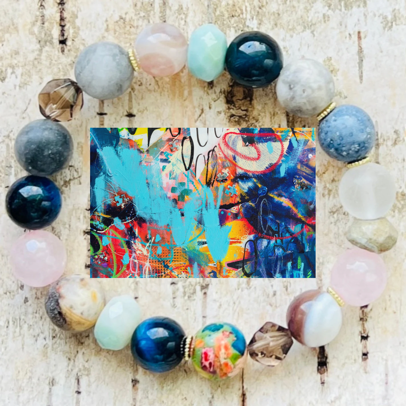 Stones: Faceted Amazonite, Blue Tiger Eye, Botswana Agate, Pink Jade, Smokey Quartz, Matte Gray Quartz, Blue Coral, and Multi-Sea Sediment Jasper.