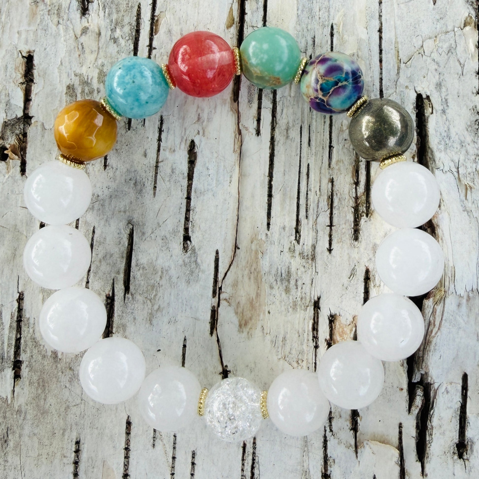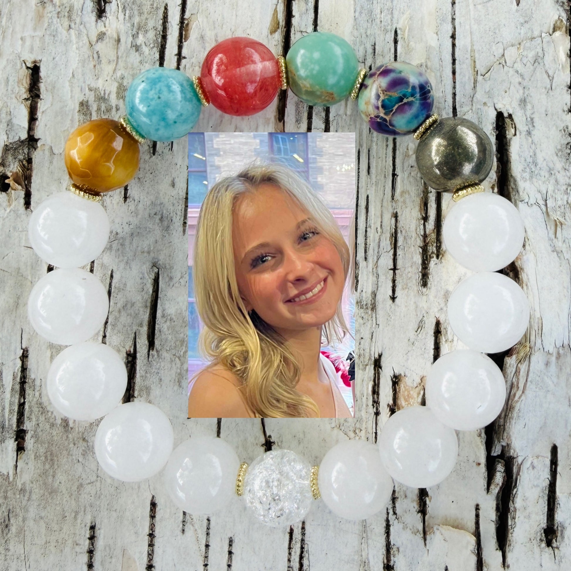 From left to right: The white jade represents Laney's pureness and her love of white. The pyrite is a heavy stone that represents her groundedness and her ability to anchor into those she loves. The multi-colored Jasper represents her sass and vibrancy, which make her stand out. The aqua terra Jasper is a calming natural stone that represents how she loves and cares for animals and the world around her. The pink fire quartz represents her feminine beauty and her love for baby's breath flowers. The blue natural hemimorphite is the salty sea, with the sun, her Ray, next to it in faceted tiger eye. The cracked clear quartz at the bottom is her Heavenly reflection for all that she was while here on Earth, reminding us that her presence is forever.