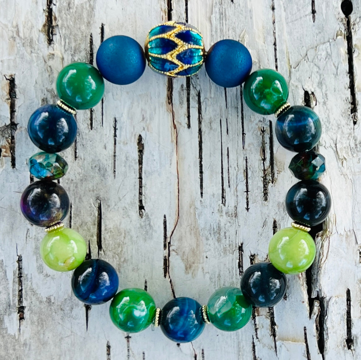 Keywords: peacock bracelet, confidence and beauty jewelry, cloisonné bead bracelet, tiger eye and agate meaning, show your colors gift, radiant self-expression, handmade vibrant bracelet