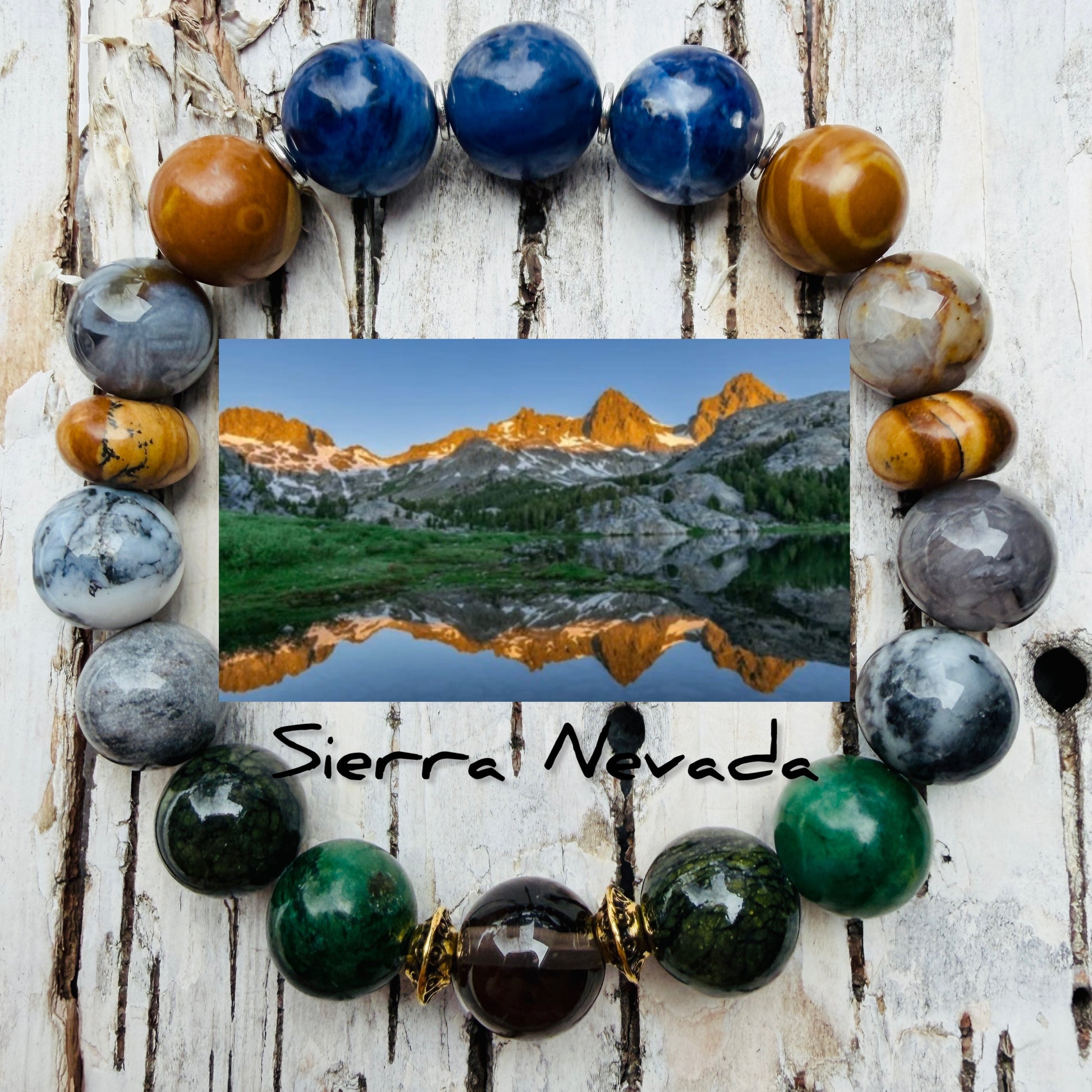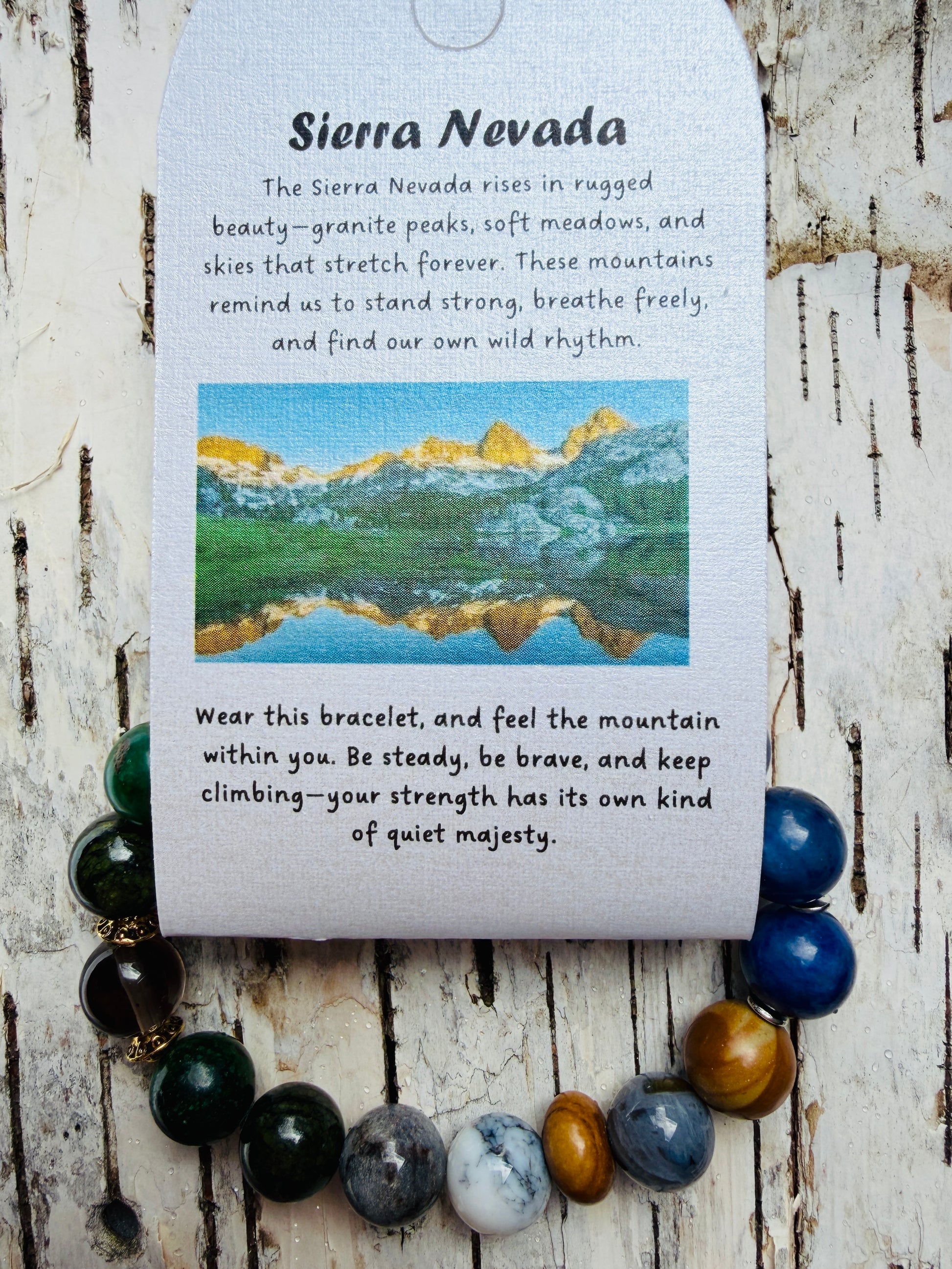 Keywords: Sierra Nevada bracelet, mountain bracelet, nature inspired jewelry, hiking bracelet, outdoor adventure jewelry, grounding gemstone bracelet, wilderness bracelet, inner strength jewelry, boho mountain bracelet, granite peak bracelet, handmade gemstone bracelet, rugged beauty jewelry, brave and steady bracelet, mountain rhythm bracelet, adventure gift for her